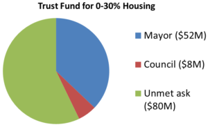 The Mayor increased the amount of the Housing Production Trust Fund (from $100 million to $130 million). The Council then increased the portion of the funds that goes to the lowest income residents (from 40% to 50%) but reduced the amount of the Trust Fund to $120 million, leaving about $60 million in the Trust Fund devoted to the lowest income housing. $80 million of our ask is unfunded. The Council found an additional $5.77 million for an operating match, leaving $15.52 million unfunded.