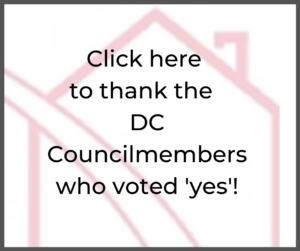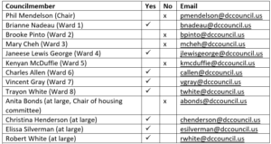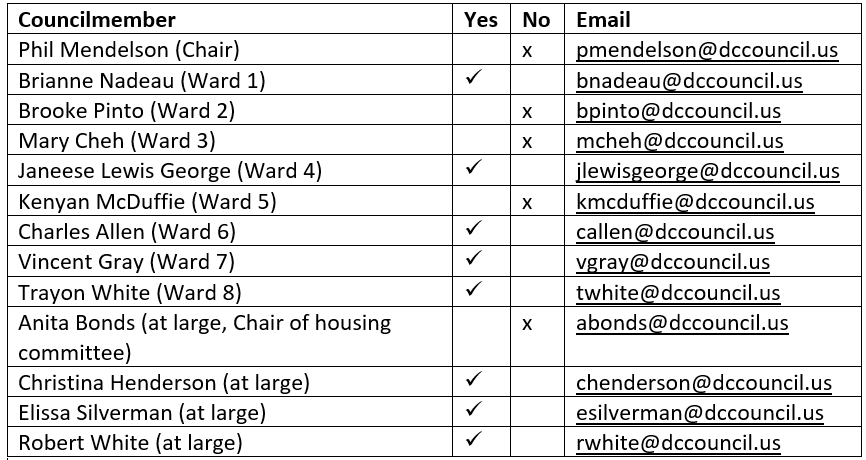 We are inspired by and grateful for the outpouring of community support for this measure – thanks to many of you, DC’s elected leaders heard that support loud and clear. The measure to increase taxes on high-income earners (led by Councilmembers Nadeau, Allen and Lewis George) passed by an 8-5 vote, funding enough vouchers to end homelessness for 2400 individuals and families, as well as ensuring higher wages for childcare workers and expanding DC’s Earned Income Tax Credit, a program that helps out low-wage workers. You can thank the eight Councilmembers who voted “yes” here, or you can use the chart below to reach out to specific members.
